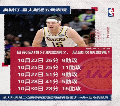 本赛季的前五场比赛,与东契奇并肩两场,独掌大局三场,里夫斯总计拿到了171分50次助攻,个人总得分位列联盟第二,个人总助攻数高居联盟第一,并且超过了包括他的偶像科比-布莱恩特在内的一众湖人名宿,成为了紫金军团历史上首位在赛季前五场比赛总计砍下150分50次助攻的球员。