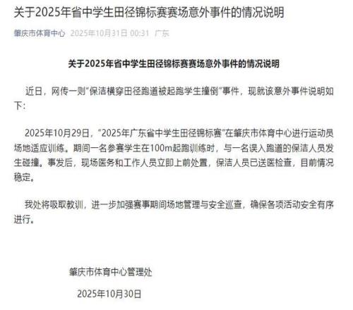 新京报讯 肇庆市体育中心管理处10月30日发布《关于2025年省中学生田径锦标赛赛场意外事件的情况说明》: